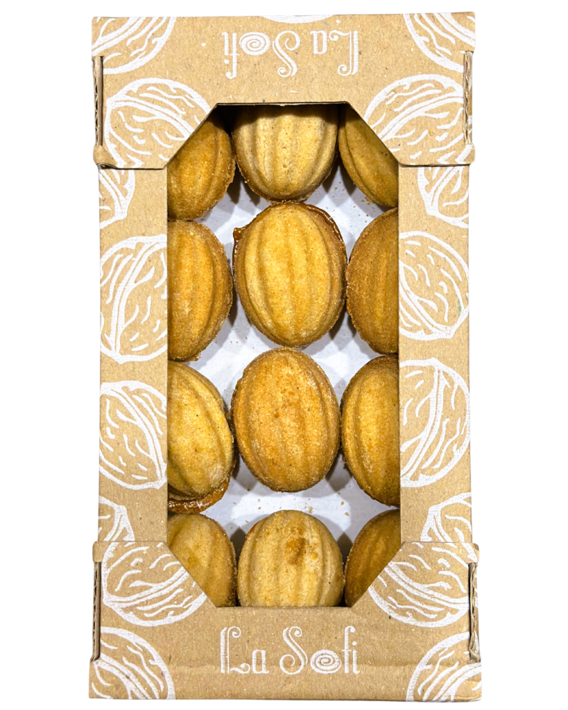 ПЕЧИВО ГОРІШОК (борошно гречане, маргарин молочний 82% жиру (олії рослинні в натуральному та частково гідрогенізованому вигляді рафіновані дезодоровані, вода питна, сіль кухонна, лецитин соєвий, консервант кислота сорбінова, ароматизатор «масло», регулятор кислотності кислота молочна, барвник бета-каротин), борошно пшеничне в/г , цукрова пудра, яйця курячі (меланж)/яєчний порошок, вода питна, пекарський порошок (сода харчова, натрій двовуглекислий, лимонна кислота), сіль кухонна. НАЧИНКА (молоко незбиране згущене варене 8,5% жиру (молоко коров’яче незбиране, молоко коров’яче знежирене, цукор)).ТМ LaSofi: печиво за ДСТУ 3781:2014, згущене молоко за ДСТУ 4274:2003