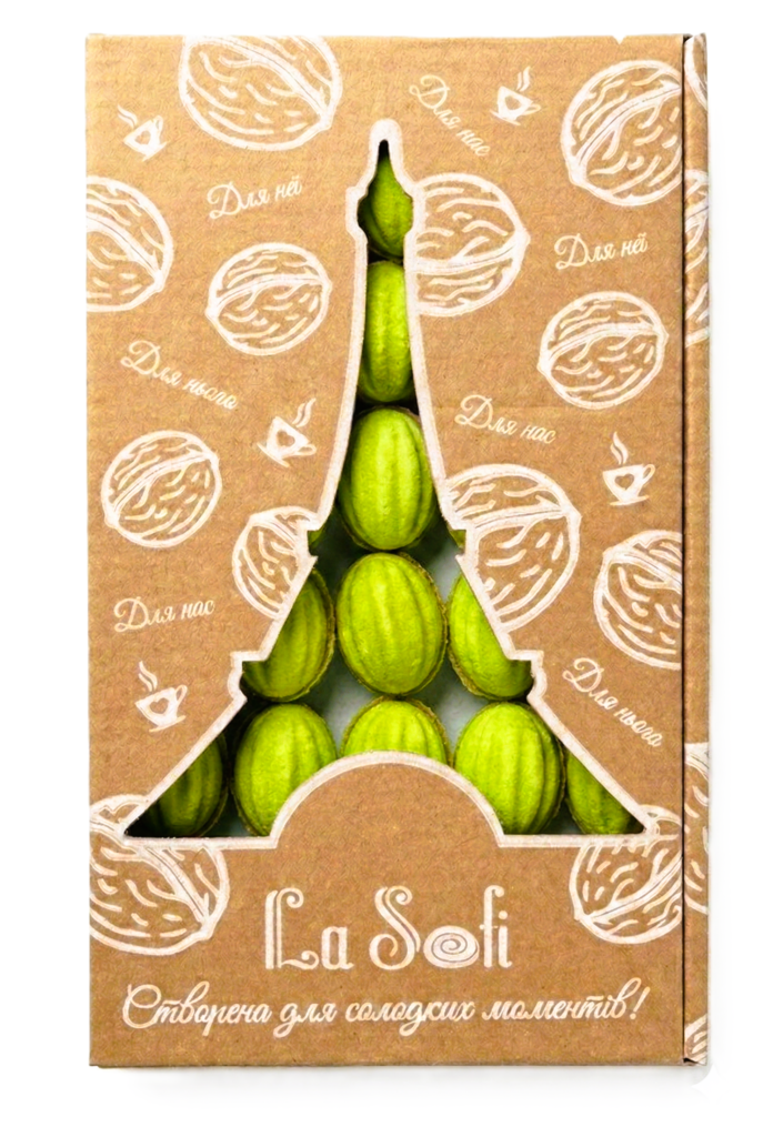 ПЕЧИВО ГОРІШОК (борошно пшеничне в/г, маргарин молочний 82% жиру (олії рослинні в натуральному та частково гідрогенізованому вигляді рафіновані дезодоровані, вода питна, сіль кухонна, лецитин соєвий), консервант кислота сорбінова, ароматизатор «масло», регулятор кислотності кислота молочна, барвник бета-каротин), цукрова пудра, яйця курячі (меланж)/яєчний порошок, вода питна, пекарський порошок (сода харчова, натрій двовуглекислий, лимонна кислота), сіль кухонна), НАЧИНКА (фундукова паста з арахісом (фундук 60%, арахіс, соняшникова олія, мед, морська сіль), молоко незбиране згущене варене 8,5% жиру (молоко коров’яче незбиране, молоко коров’яче знежирене, цукор))ТМ LaSofi: печиво за ДСТУ 3781:2014, фундукова паста з арахісом за ДСТУ 4848:2007, згущене молоко за ДСТУ 4274:2003