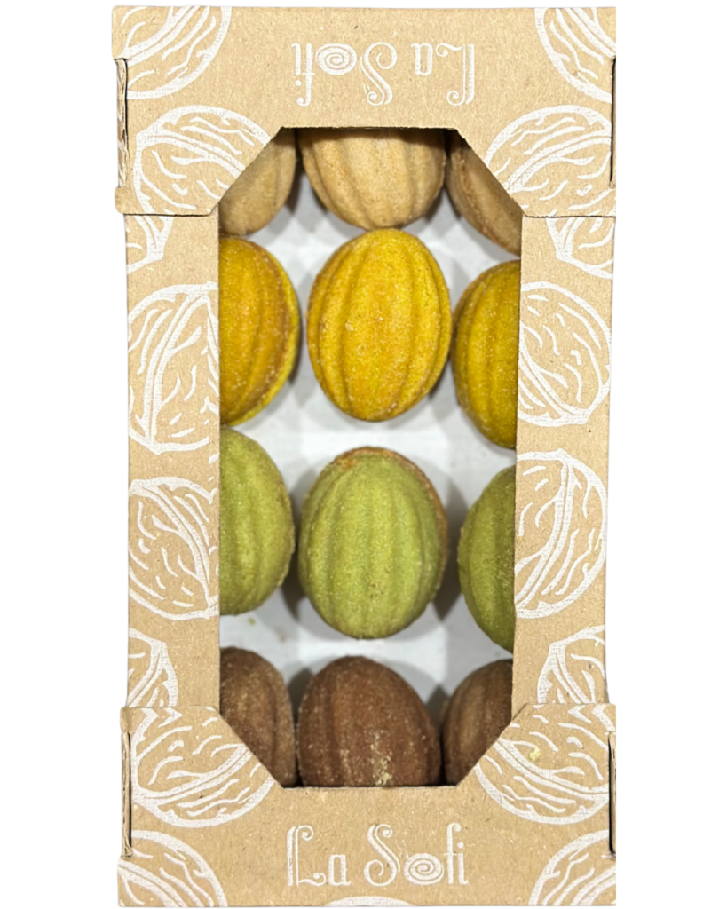 ПЕЧИВО ГОРІШОК (борошно гречане, маргарин молочний 82% жиру (олії рослинні в натуральному та частково гідрогенізованому вигляді рафіновані дезодоровані, вода питна, сіль кухонна, лецитин соєвий, консервант кислота сорбінова, ароматизатор «масло», регулятор кислотності кислота молочна, барвник бета-каротин), борошно пшеничне в/г , цукрова пудра, яйця курячі (меланж)/яєчний порошок, вода питна, пекарський порошок (сода харчова, натрій двовуглекислий, лимонна кислота), бета-каротин/ хлорофіл/ какао порошок знежирений, сіль кухонна. НАЧИНКА (класична арахісова паста (арахіс, соняшникова олія, цукор, морська сіль), молоко незбиране згущене варене 8,5% жиру (молоко коров’яче незбиране, молоко коров’яче знежирене, цукор)) НАЧИНКА (фундукова паста з арахісом (фундук 60%, арахіс, соняшникова олія, мед, морська сіль), молоко незбиране згущене варене 8,5% жиру (молоко коров’яче незбиране, молоко коров’яче знежирене, цукор)) НАЧИНКА (шоколадно-фундукова паста (цукор, соняшникова олія, какао порошок знежирений 12%, фундук 9,7%, сухе молоко знежирене, суха молочна сироватка, емульгатор - соєвий лецитин, ароматизатор ідентичний натуральному (ванілін)), молоко незбиране згущене варене 8,5% жиру (молоко коров’яче незбиране, молоко коров’яче знежирене, цукор))ТМ LaSofi: печиво за ДСТУ 3781:2014, горіхові пасти за ДСТУ 4848:2007, згущене молоко за ДСТУ 4274:2003