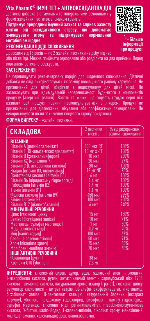 Імунітет + Антиоксидантна дія Vita PharmX® від виробника — це комплекс вітамінів, мінералів і коензиму Q10 у формі смачних желейних пастилок зі смаком граната для щоденної підтримки організму. Формула поєднує вітаміни A, C, D, E, групи B, цинк, селен та інші мікронутрієнти, що сприяють нормальному функціонуванню імунної системи та захисту клітин від оксидативного стресу. Активні компоненти допомагають зменшувати втому, підтримувати енергетичний обмін і загальний тонус. Зручний формат прийому — лише 2 пастилки на добу для дорослих від 18 років..