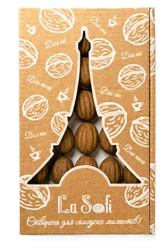 ПЕЧИВО ГОРІШОК (борошно пшеничне в/г, маргарин молочний 82% жиру (олії рослинні в натуральному та частково гідрогенізованому вигляді рафіновані дезодоровані, вода питна, сіль кухонна, лецитин соєвий), консервант кислота сорбінова, ароматизатор «масло», регулятор кислотності кислота молочна, барвник бета-каротин), цукрова пудра, яйця курячі (меланж)/яєчний порошок, вода питна, пекарський порошок (сода харчова, натрій двовуглекислий, лимонна кислота), сіль кухонна), НАЧИНКА (шоколадно-фундукова паста (цукор, соняшникова олія, какао порошок знежирений 12%, фундук 9,7%, сухе молоко знежирене, суха молочна сироватка, емульгатор - соєвий лецитин, ароматизатор ідентичний натуральному (ванілін)), молоко незбиране згущене варене 8,5% жиру (молоко коров’яче незбиране, молоко коров’яче знежирене, цукор))ТМ LaSofi: печиво за ДСТУ 3781:2014, шоколадно-фундукова паста за ДСТУ 4848:2007, згущене молоко за ДСТУ 4274:2003